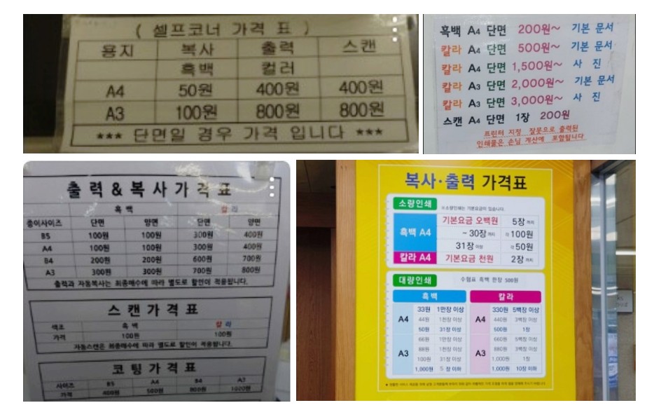 복사 가격은 보통 흑백(A4) 100원, 컬러(A4) 300원 정도